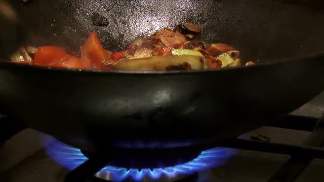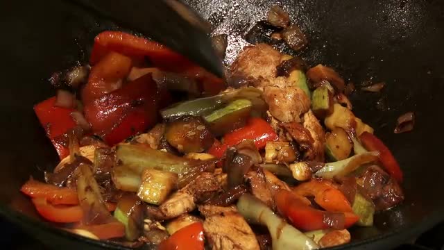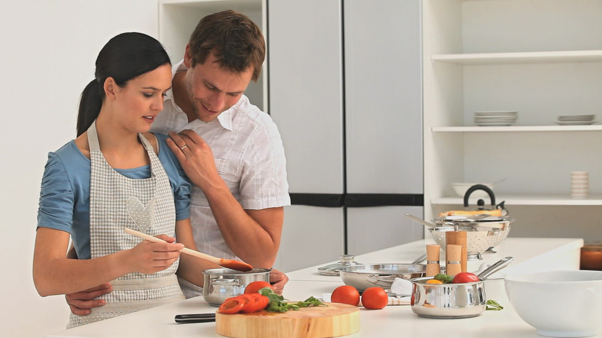 Top view of young couple cooking at home. Man stewing meat in the pan, while woman making a sauce