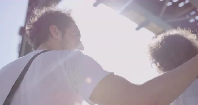 Steadicam shot of young happy couple having morning run in the city. Getting healthy with everyday sports
