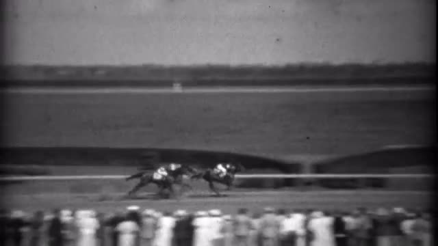 > 1935: Horses coming around the corner in race at old time racetrack. HIALEAH, FLORIDA