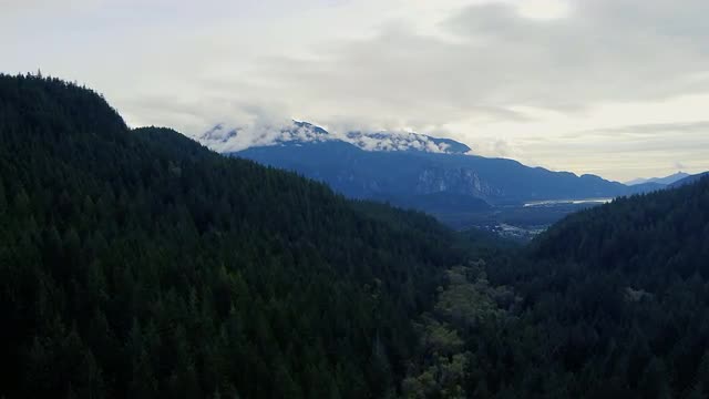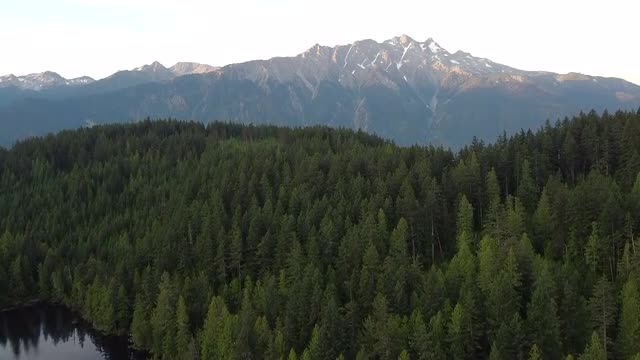 This is a tracking shot down an empty winter road with spruce trees lining both sides of the road.
