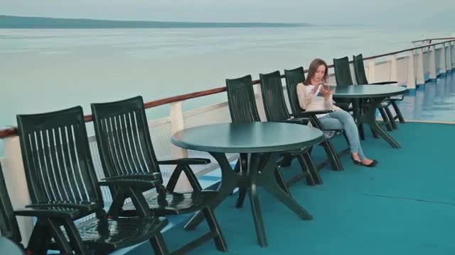 Sihouette of a man working with tablet computer aboard. He standing in dark cabin by the window with sea view