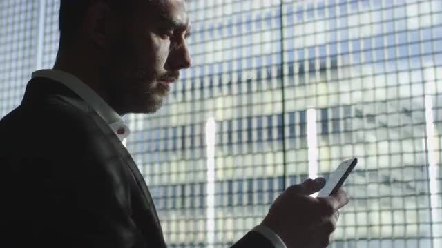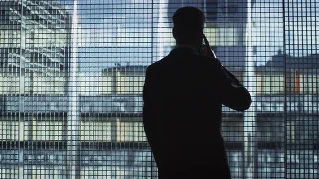 Silhouette profile view of an adult man with phone opening curtain and looking at the smart phone near the window of cruise ship