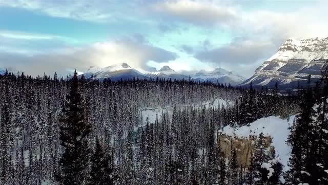 This is an aerial push towards an valley in the Canadian Rockies in the winter.