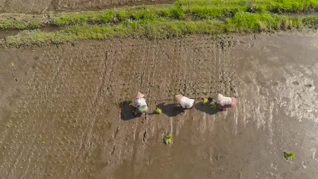 Wide slow motion aerial footage of tractors ploughing and birds flying