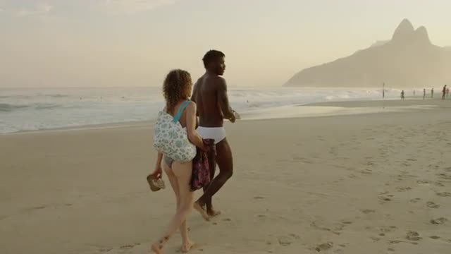 > Friends play with dog on beach