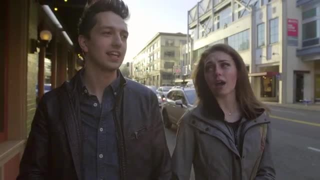 309871 - A young couple chatting outside of a downtown cafe