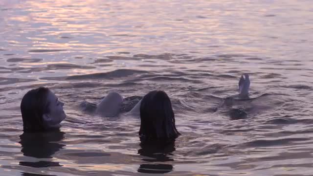 573810 - Teen Girls Float On Their Backs In The Ocean, Lift Their Feet Out Of Water