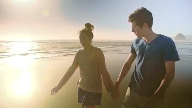 Teenage couple hold hands and walk down beach
