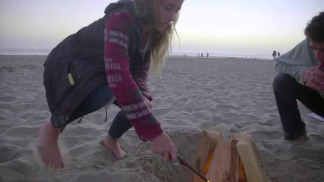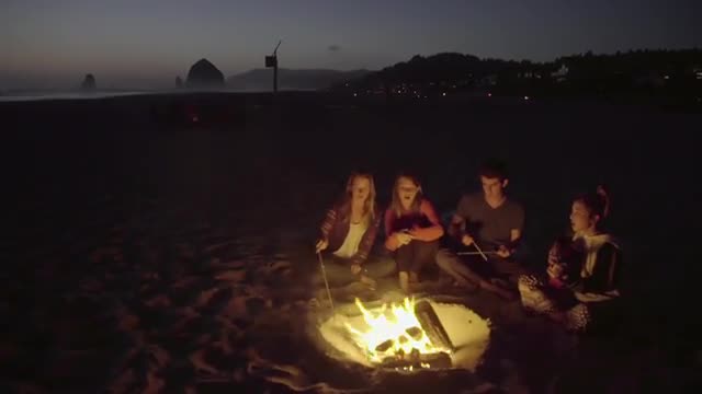Group of teenage friends sit by the fire together at the beach