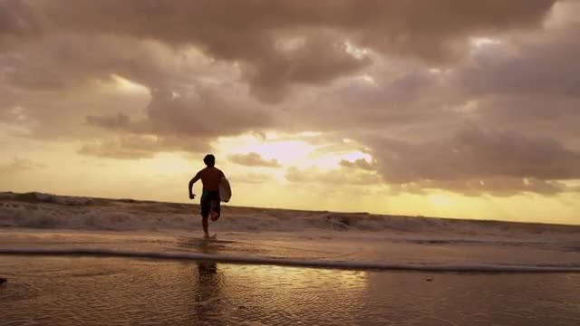 472744 - Silhouette Surfer Girl Walking On Beach at Sunset In Slow Motion