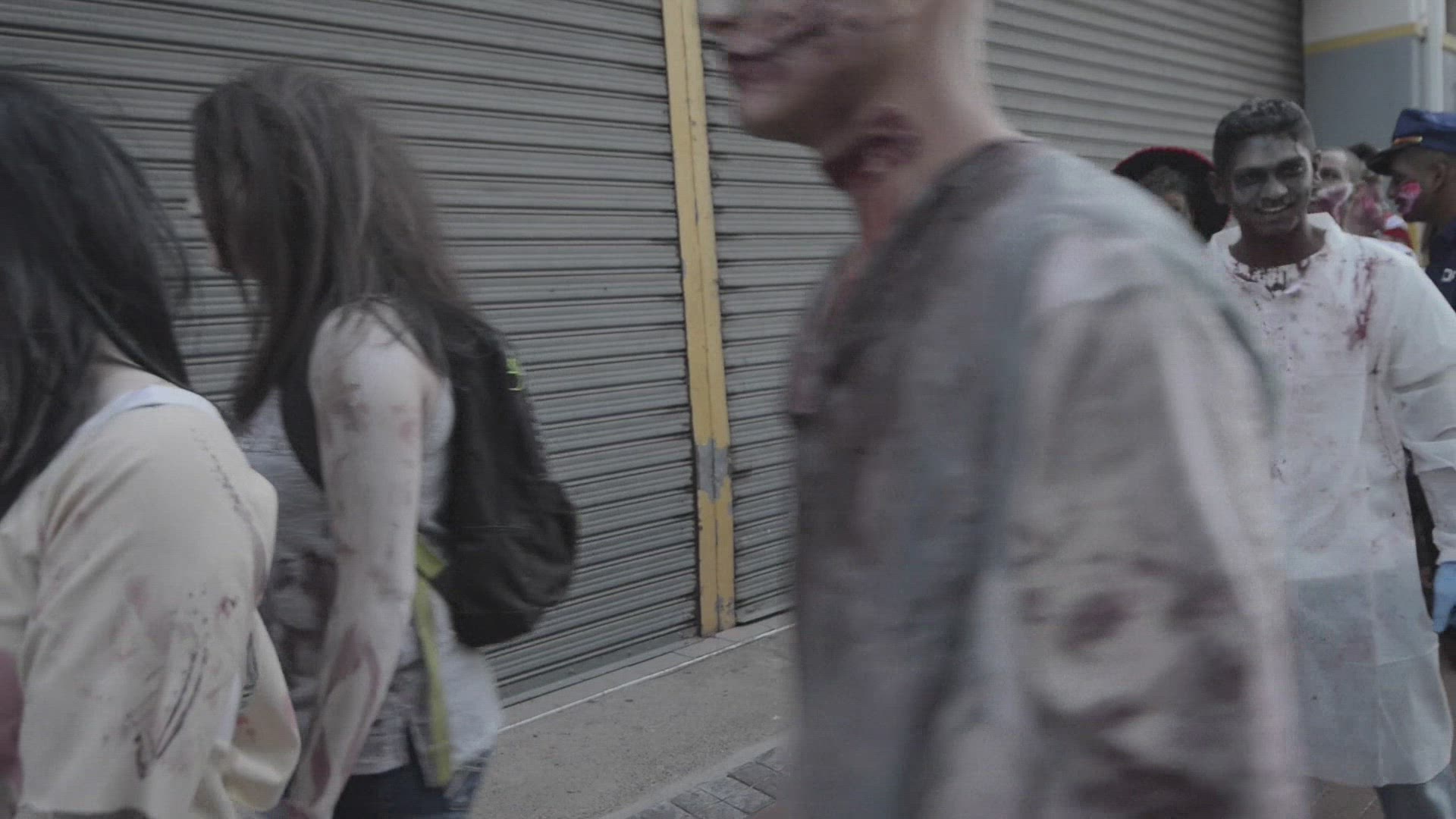 Man and woman tourists looking at children clothes being sold outdoor in the street