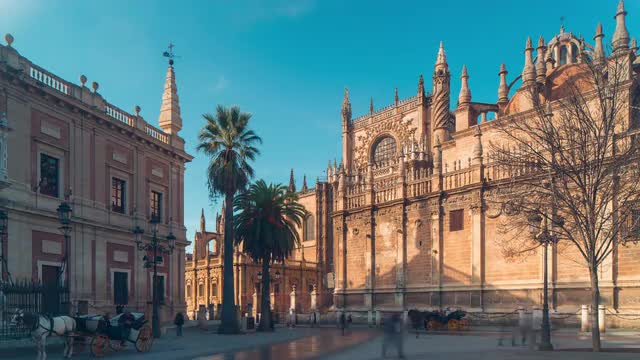 Steadicam shot of a bright sun shining among the tree branches and between old classic style European houses