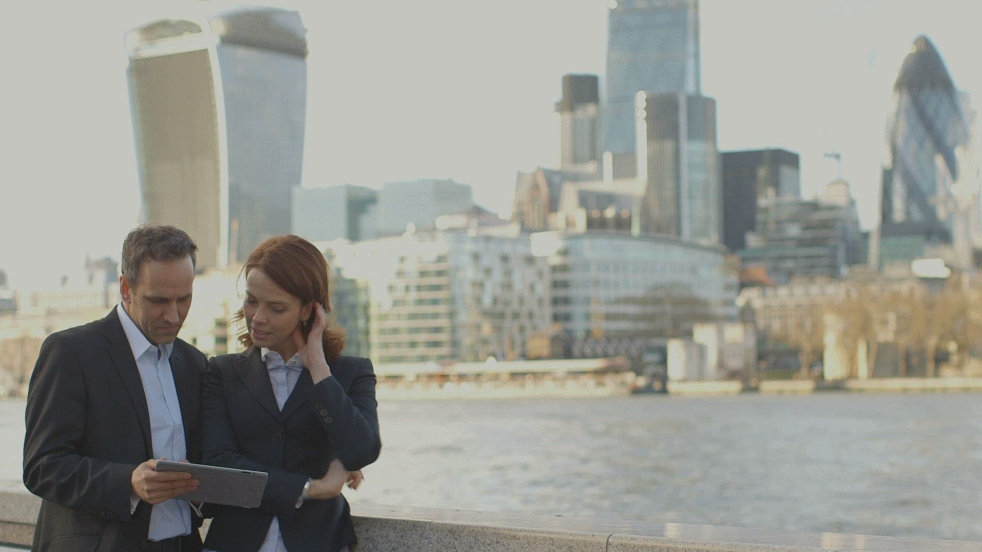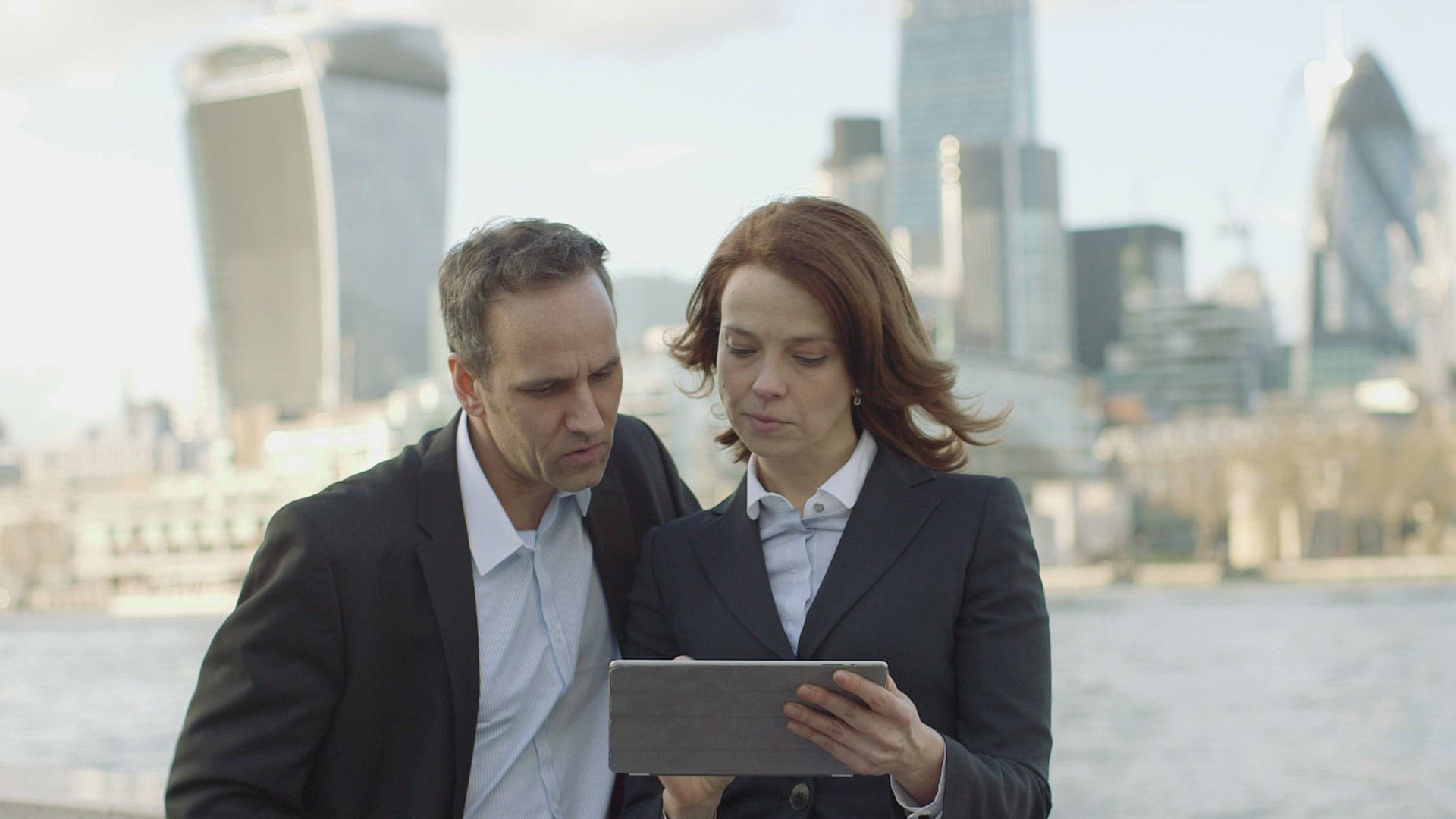 Steadicam shot of young people walking outdoor in the city in bright sunlight. They having a talk, woman using tablet computer