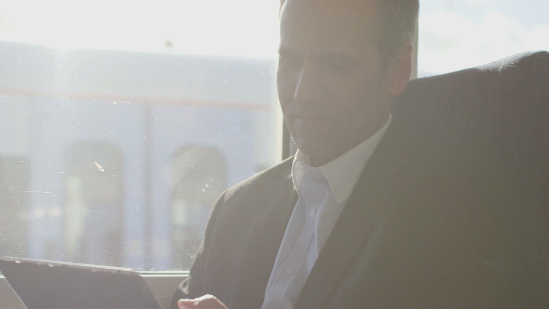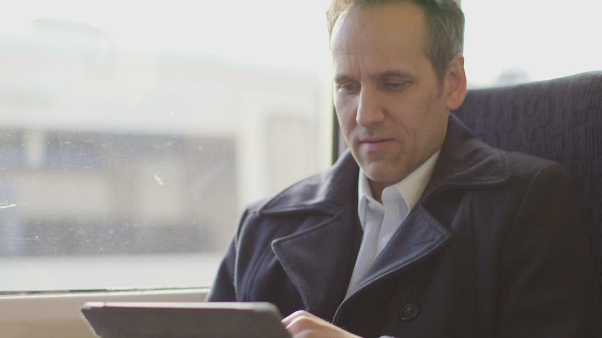 Man and woman on a train sitting against each other and using tablet computer and mobile phone