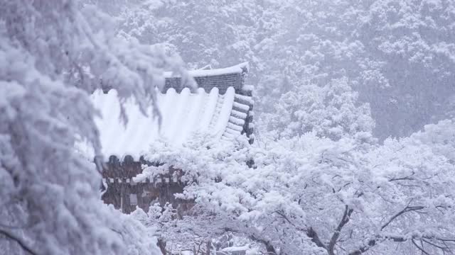 Japanese temple through the trees, with snow falling on roofs.