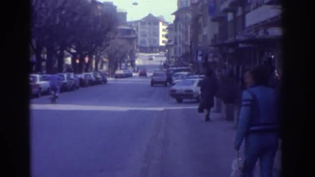 Steadicam shot of a man with retro video camera shooting a smiling woman in sunglasses who walking along the old city street on bright sunny day