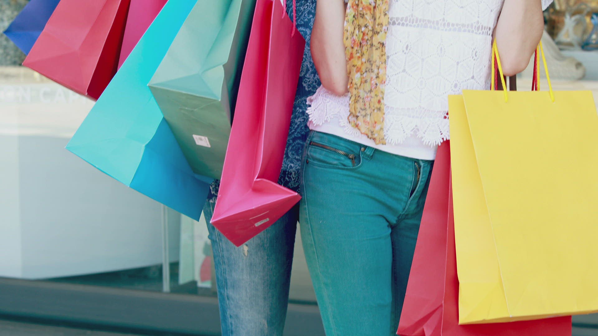 Steadicam follow shot of two people walking along the pedestrian street of Tallinn with some shopping bags.