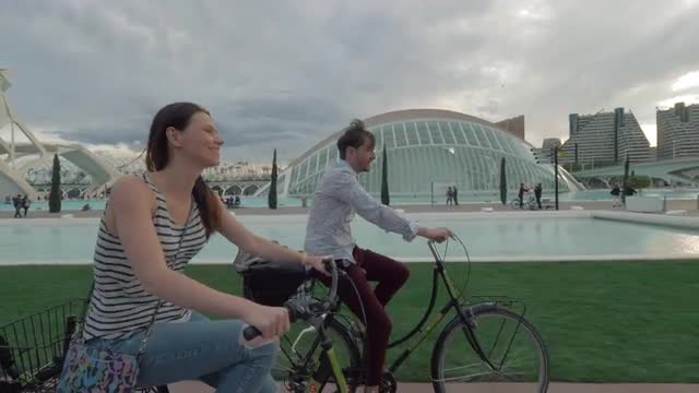 Steadicam shot of happy tourist couple traveling in the city by bicycle taxi. Transport to go sightseeing