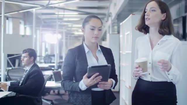 Steadicam shot of a man and woman discussing something using tablet computer while walking in the city. They passing modern glassy building against bright sunlight