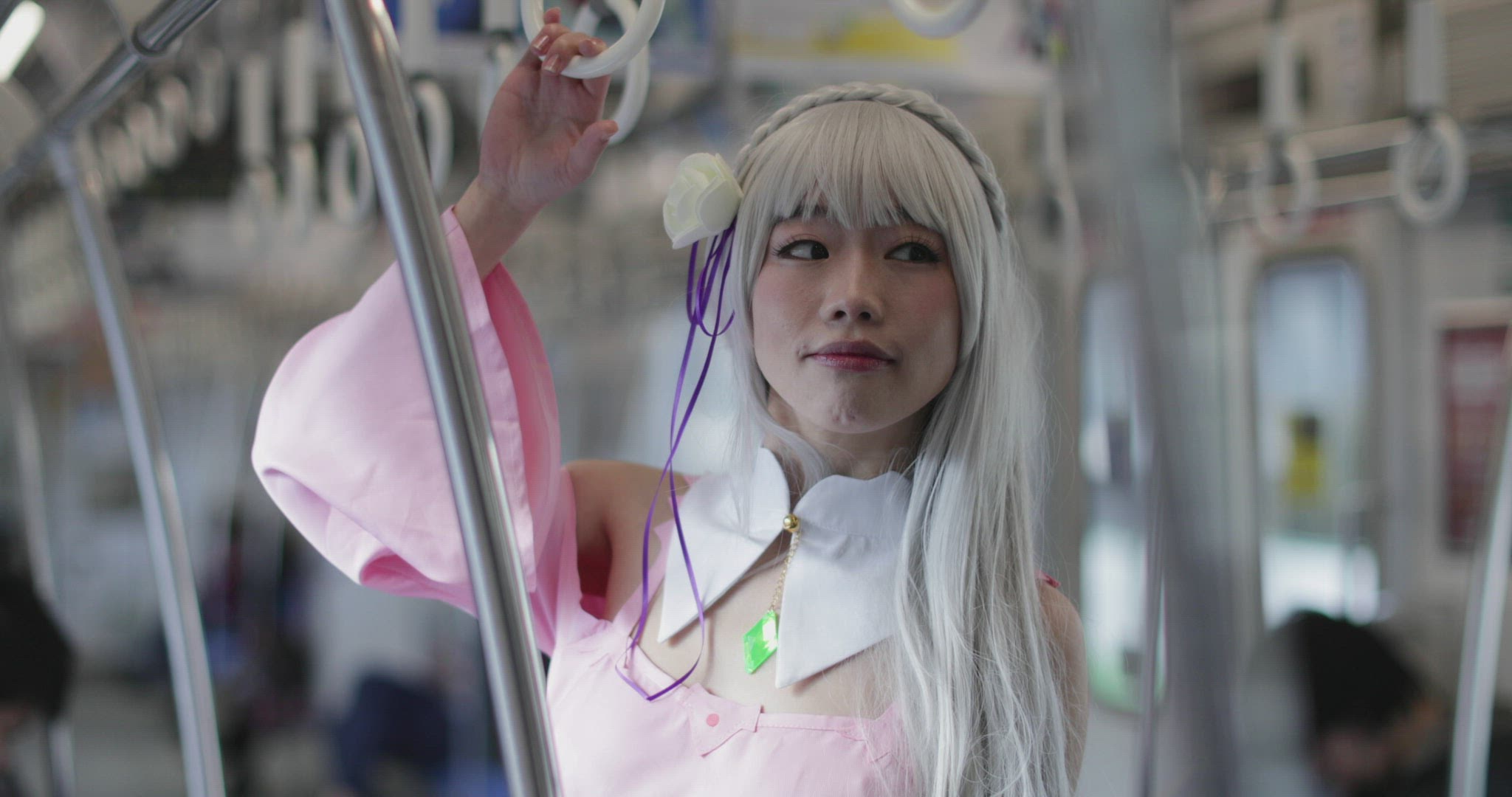 Young blonde girl with mirror using eyebrow pencil, applying powder with brush and looking through train window