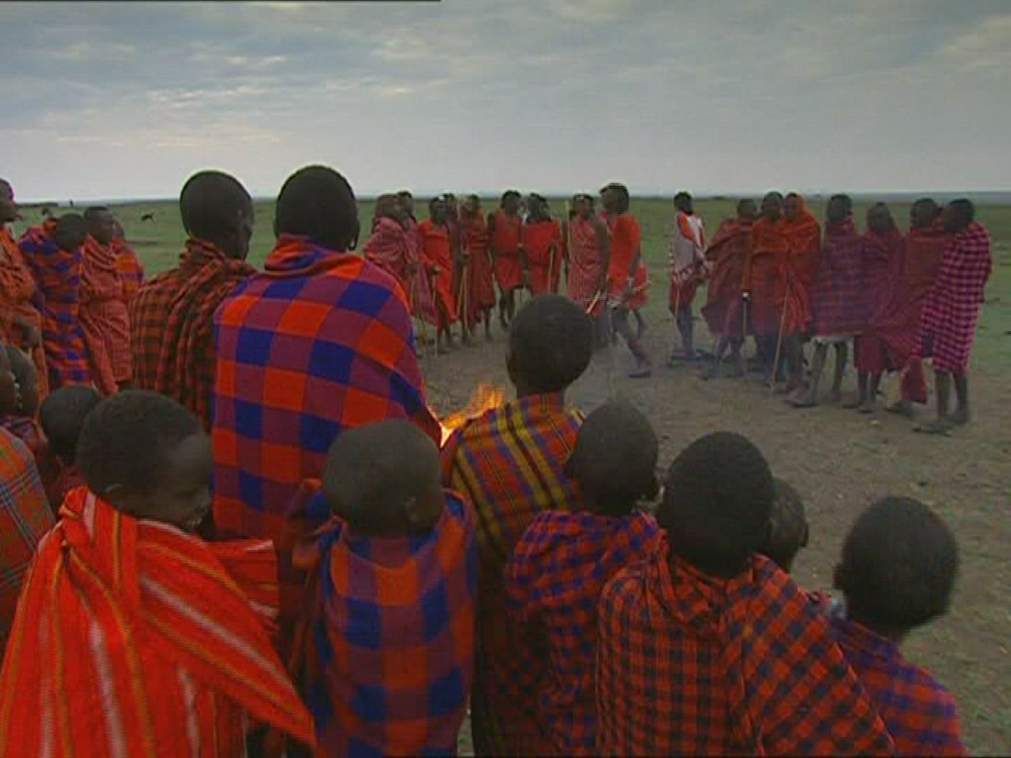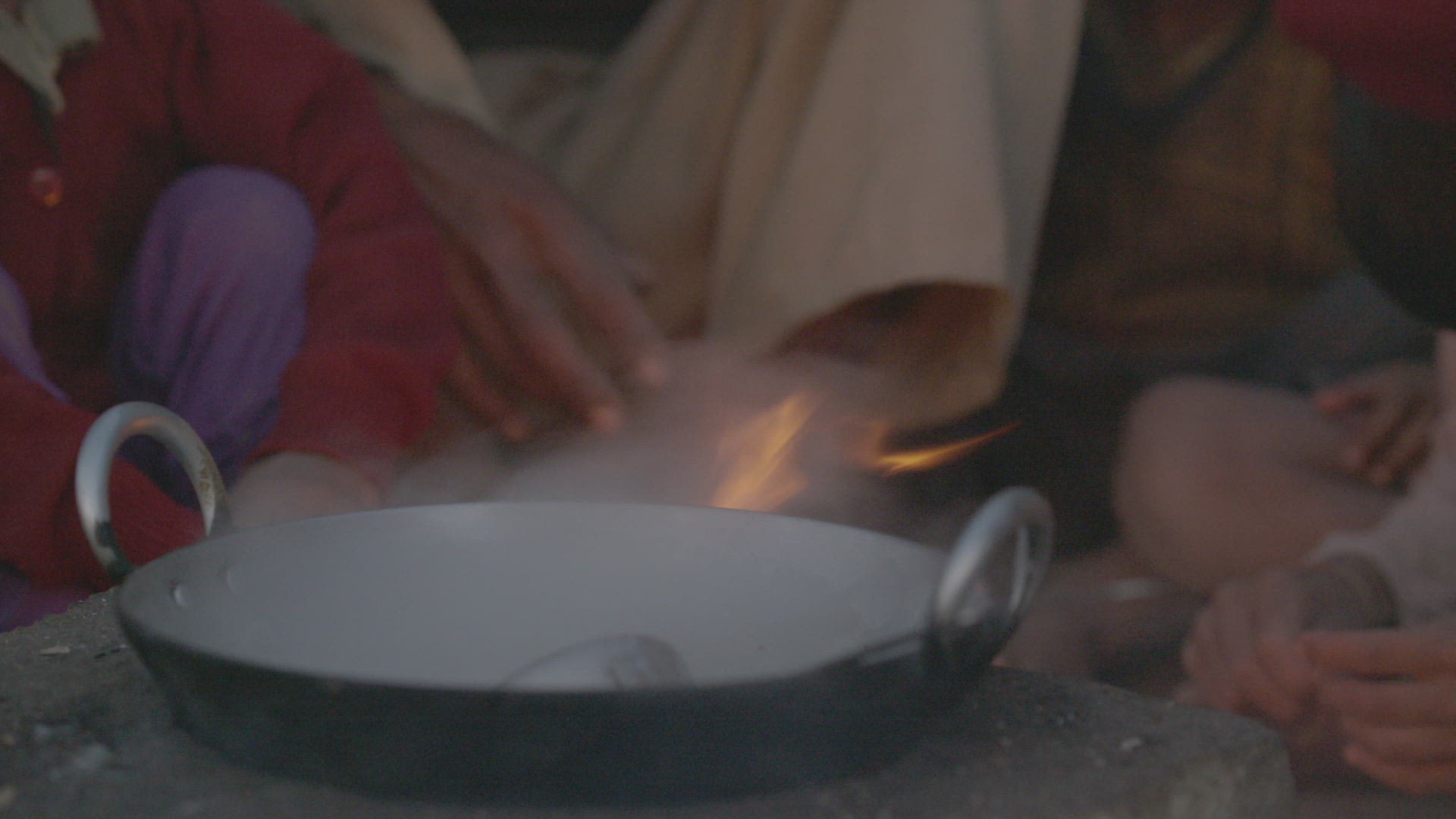> Elderly man sitting with small boy near campfire