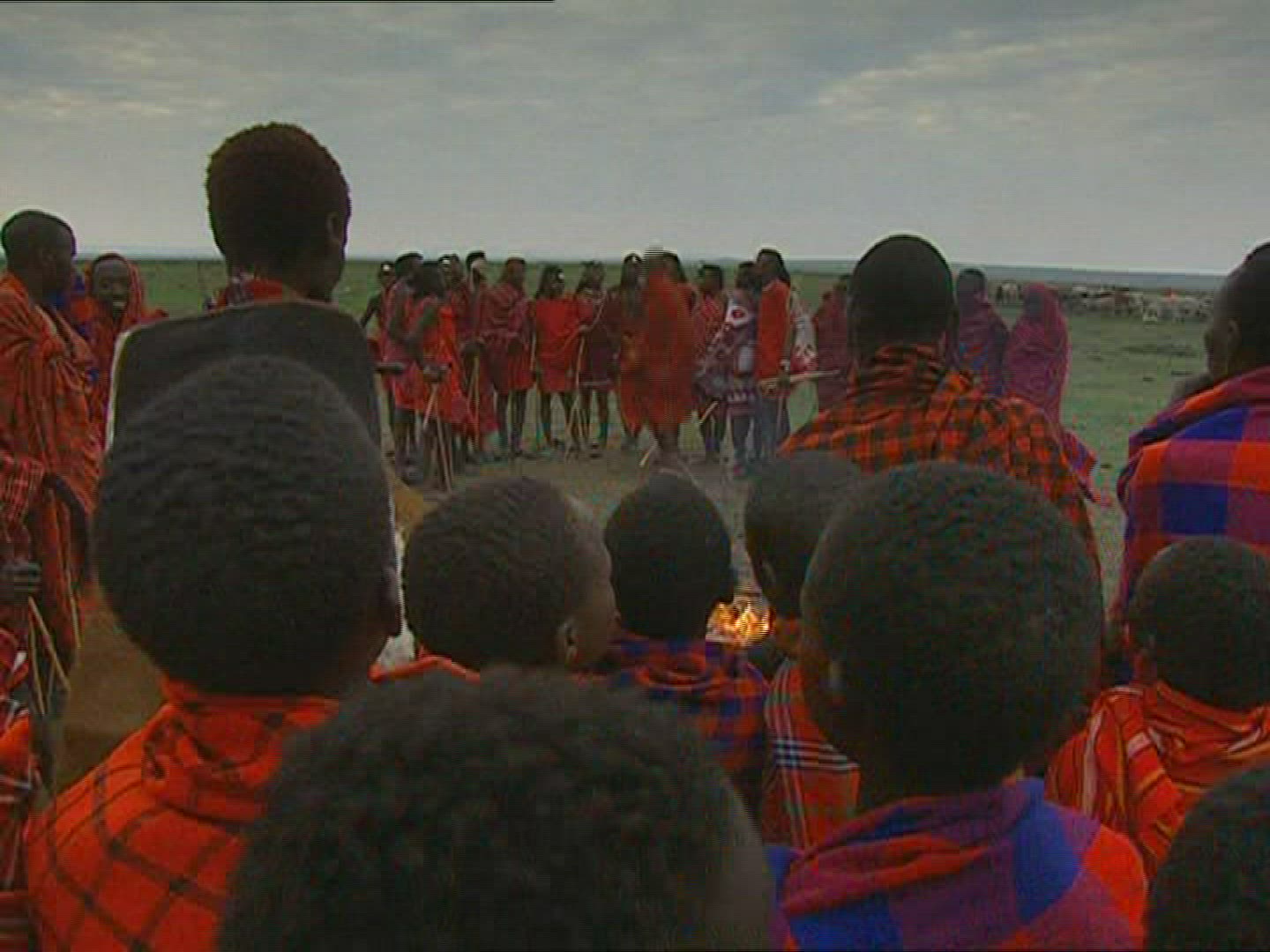 Elderly man sitting with small boy near campfire
