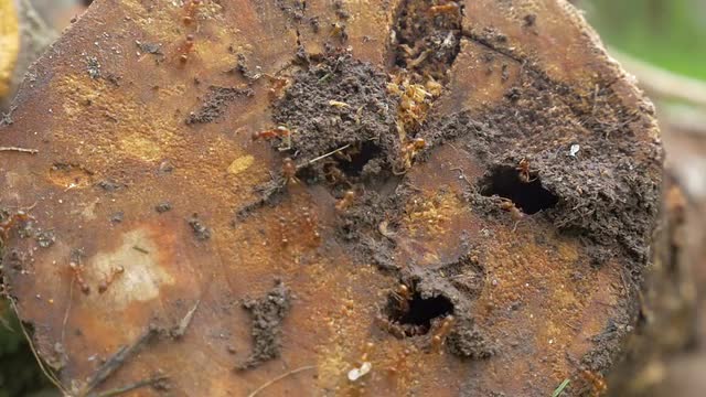 Slow motion close-up shot of red ant colony dwelling in the old log of wood. Hardworking insects moving around the timber