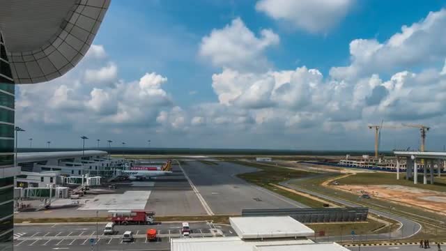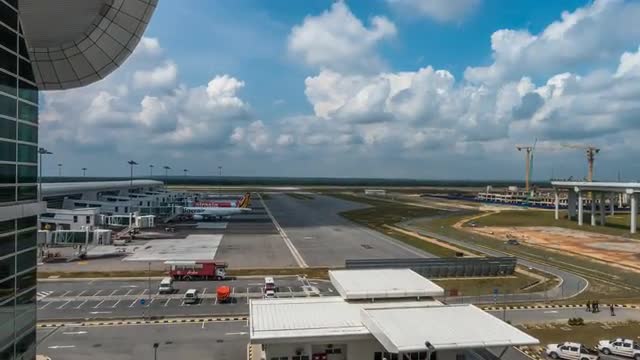 Clouds time lapse and aeroplanes taxiing to terminal at Kuala Lumpur International Airport.