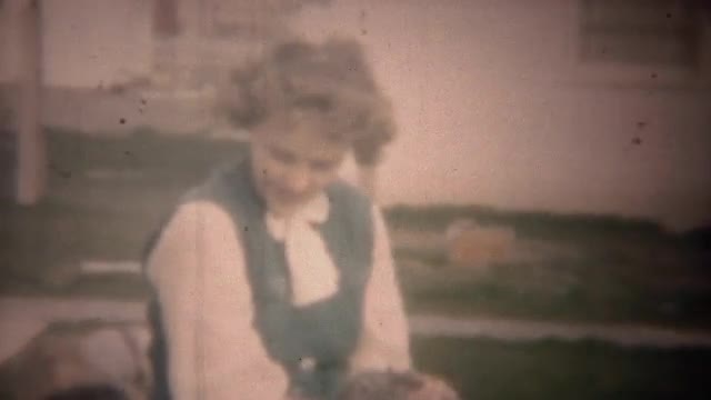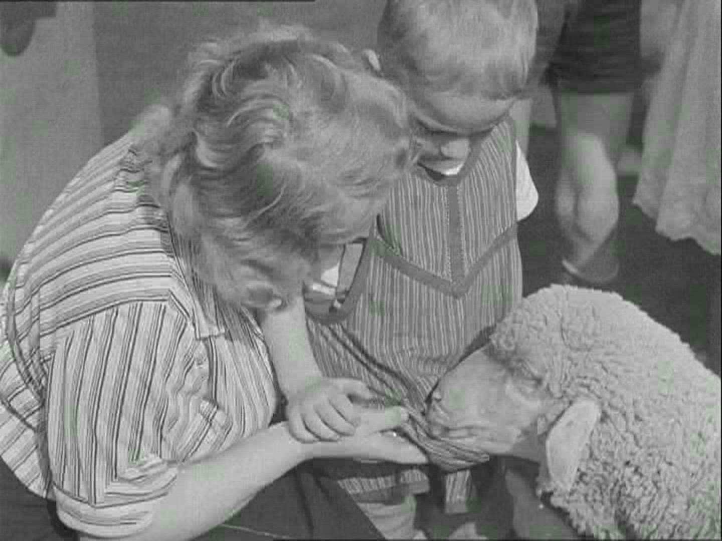 496490 - 1949: Kids playing with baby bunny rabbits with mother supervision.