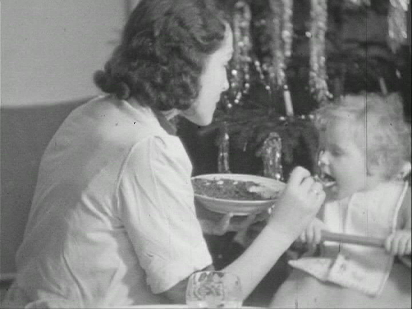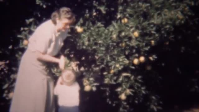 506400 - 1947: Child picking orange fruit in mother's supervision.