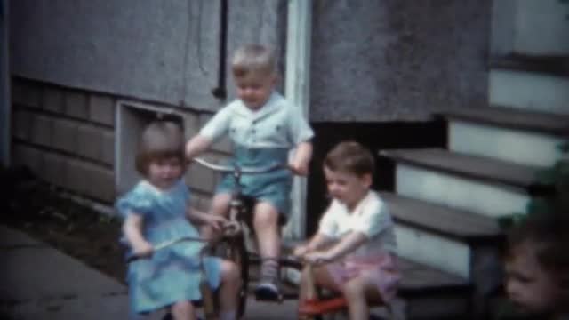 505642 - 1944: Mother readies tricycle bike for kids playing outside family home. PORTLAND, OREGON