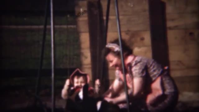 507052 - 1948: Mother helping pink hood girl child on playground swingset.
