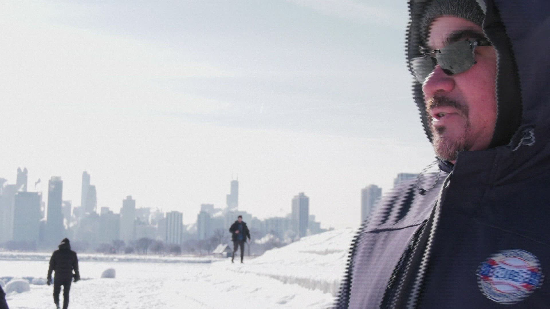 1967: Man using snowblower machine after winter storm on urban sidewalk. BUFFALO, NEW YORK