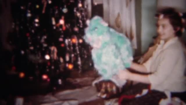 > 1962: Girl in hair curlers opens stuffed animal toy at Christmas tree. BUFFALO, NEW YORK