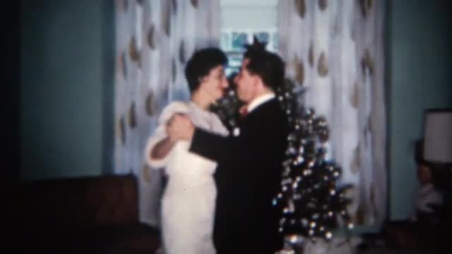 1962: Married couple celebrate Christmas with a quaint dance by the tree. BUFFALO, NEW YORK