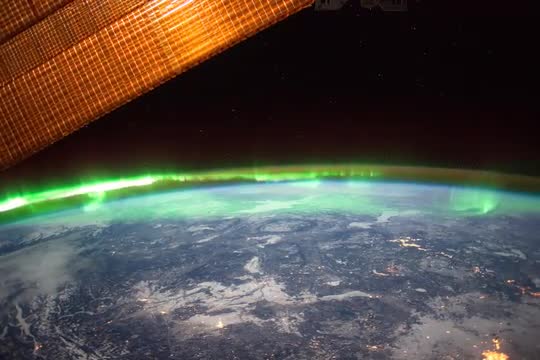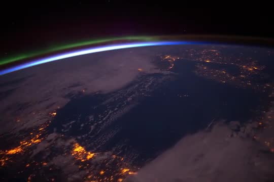 ISS flying in Earth's orbiton a long pass from the mid-Atlantic between South America and Africa ascending to the Balkan Peninsula, and rounding out on a descending pass southwest towards the Solomon Islands. The camera is west-looking, therefore the setting sun in the west is the first image seen throughout this sequence. The pass continues over the Sahara Desert in northern Africa, before hitting the Mediterranean Sea and the Balkan Peninsula. Finally, the ISS flies over Russia and Kazakhstan and begins the descending pass towards the southern Pacific Ocean. The faint lights from the Aurora Borealis can be seen near the end of the video. (av21033u)