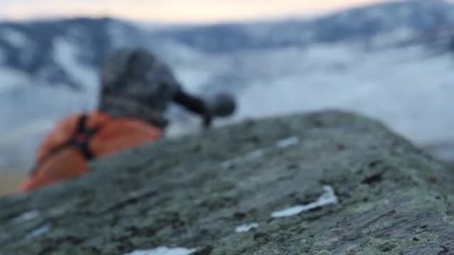 This is a hand held, rack focus shot of a hunter using some advanced binoculars on a mountainside, and the camera racks focus from the hunter to a rock, and then back to the hunter.
