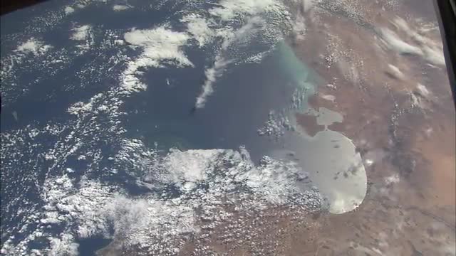 ISS flying in Earth's orbit from the North Atlantic Ocean, west of Liberia, to central Ukraine, north of the Black Sea. This video begins as the ISS heads over the terminator line, separating night and day on the Earth. As the pass continues over land, there is quite a bit of haze blocking the view of land, until the ISS continues over the clay-colored sands of northern Africa. The pass ends as the ISS is looking back at the Balkan Peninsula under heavy cloud. (av21463u)