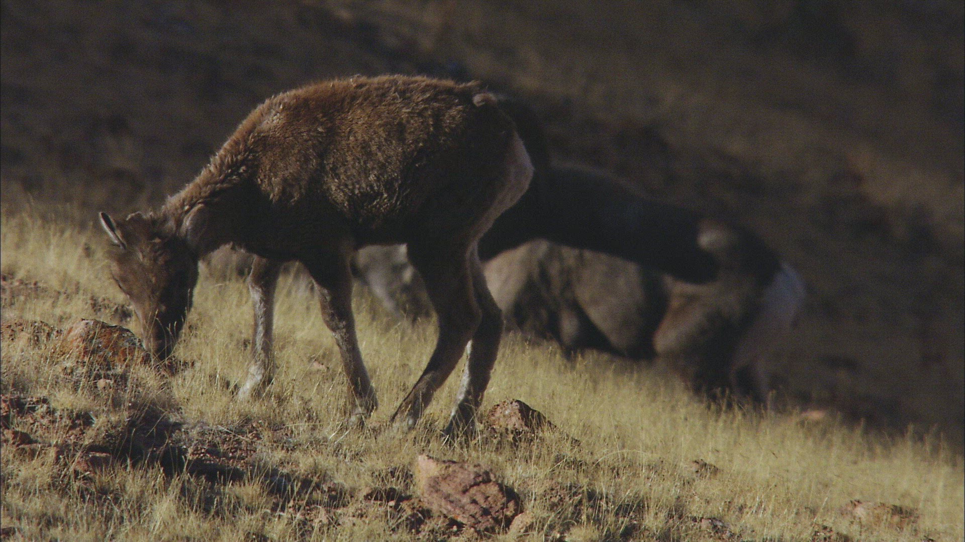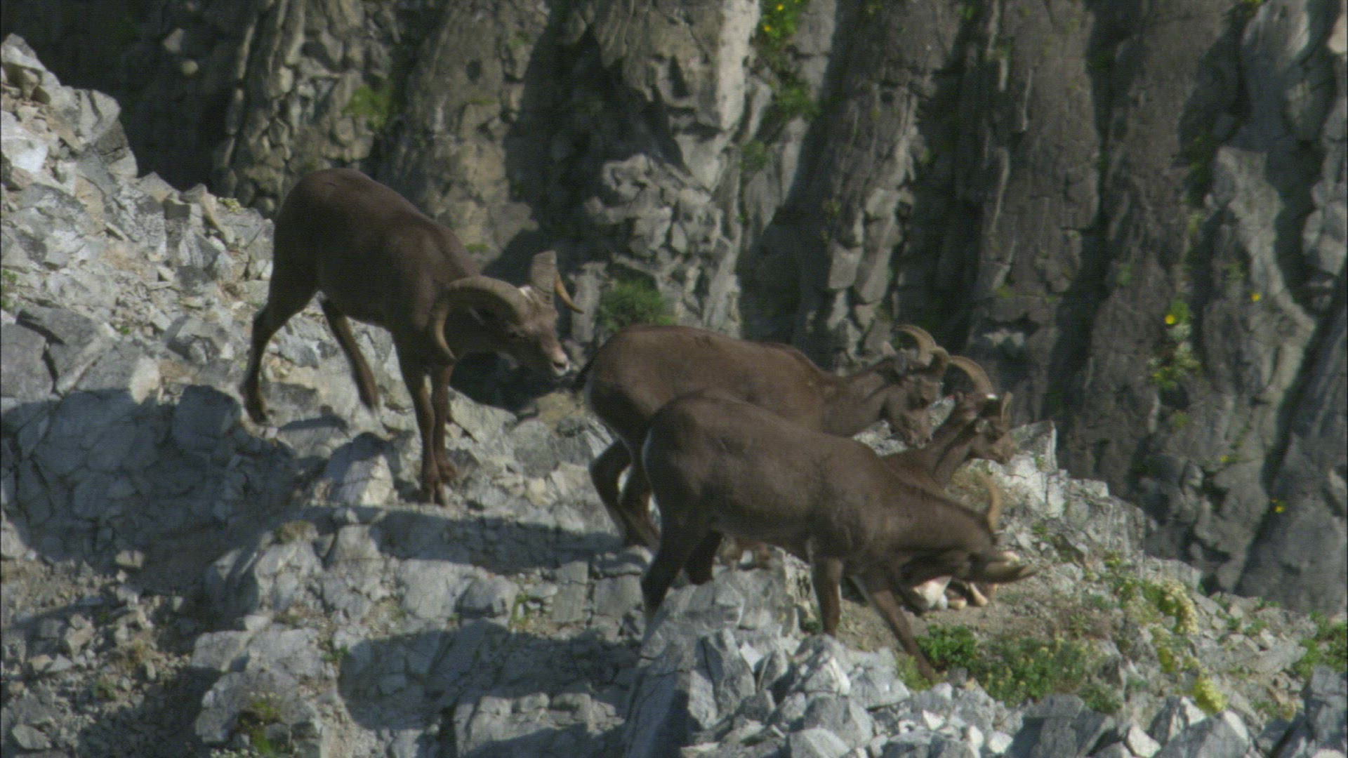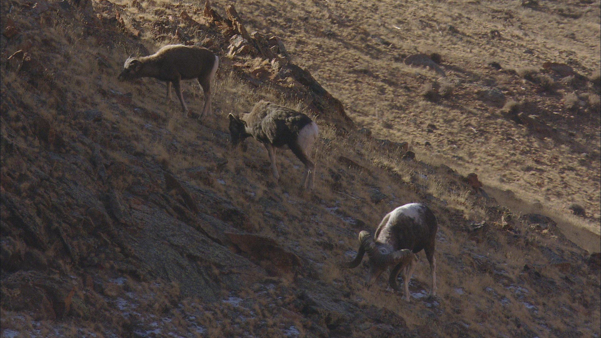 This is a static shot of a herd of rams standing together in a field. One Ram chews some plants.