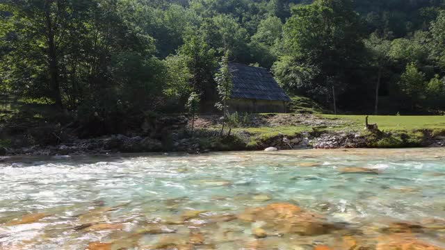 Hut and green river Time lapse 4K