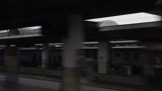 Side window view from train of Railway tracks - Point of view shot of Railway tracks