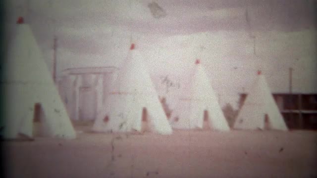 > 1957: Famous Wigwam Motel sign and teepee room lodging.