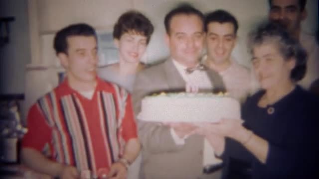 > 1959: Family with grandma's giant round white birthday cake.