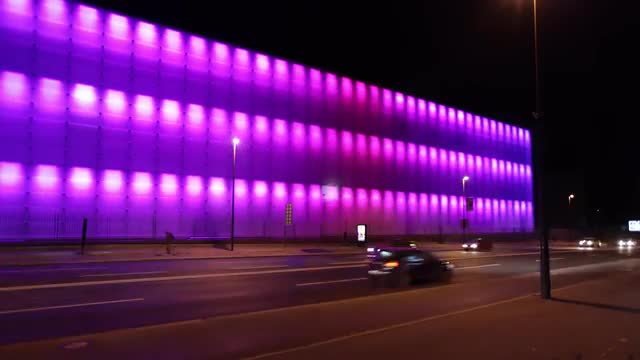 Time lapse in 4K quality showing neon lights ona building.