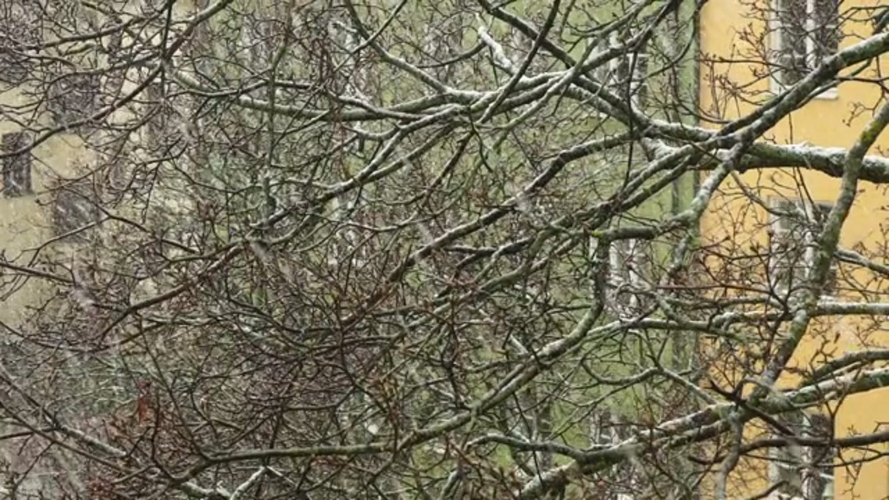 In the foreground, with shallow focus, a tree branch drips with water.