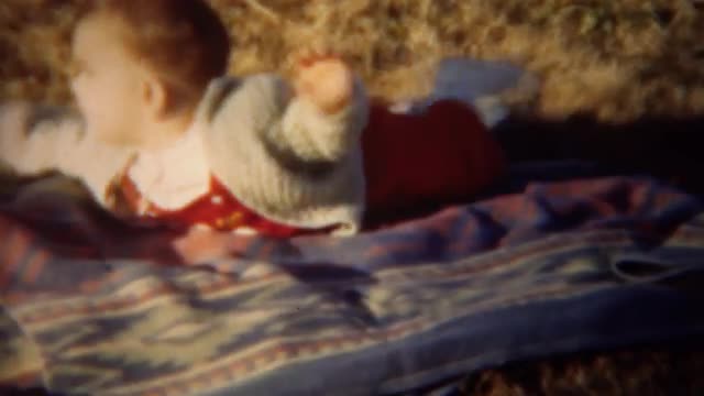 > 1951: Boy practicing tummy time in sunshine on warm blanket.