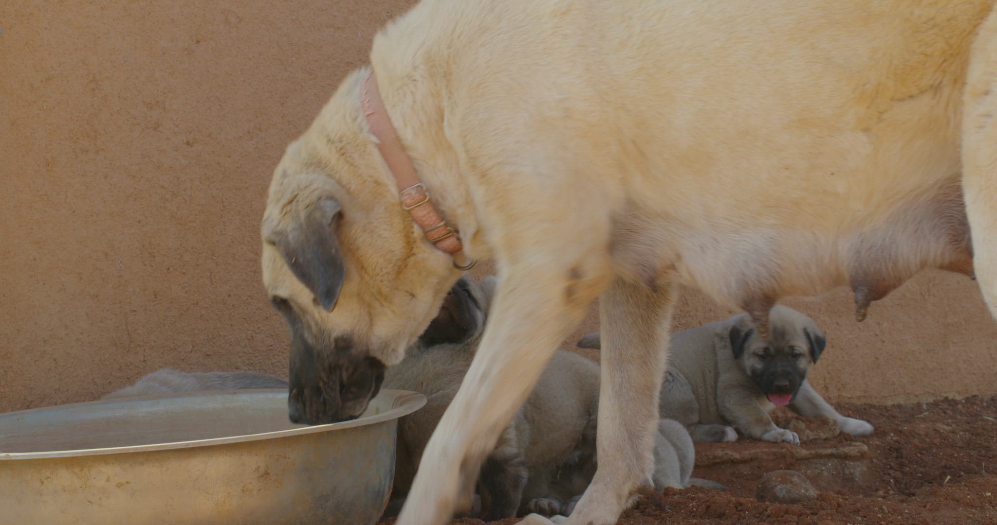 1948: Cute girl bundled up for fall plays with golden retriever puppy.