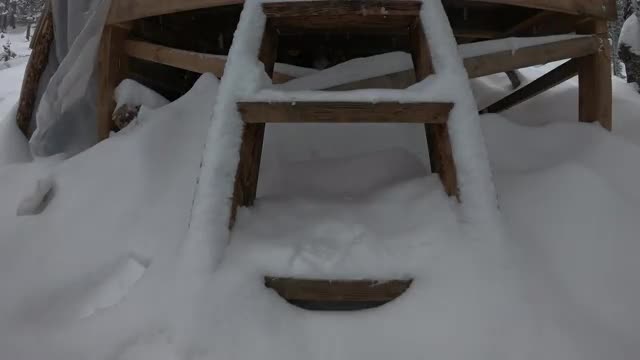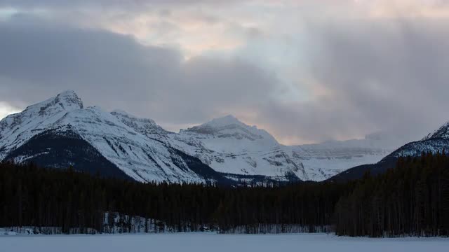 Motion time lapse of a sunset through the clouds with fields of snow and tree topped snowy peaks in the foreground