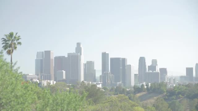 Downtown Los Angeles on a sunny summer day. Palm tree in foreground. ProRes 422 from 5Dmkiii w/ Technicolor Picture Style. Not colored.