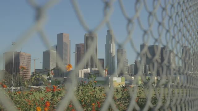 Downtown Los Angeles on a sunny summer day. Chainlink fence in foreground. ProRes 422 from 5Dmkiii w/ Technicolor Picture Style. Not colored.